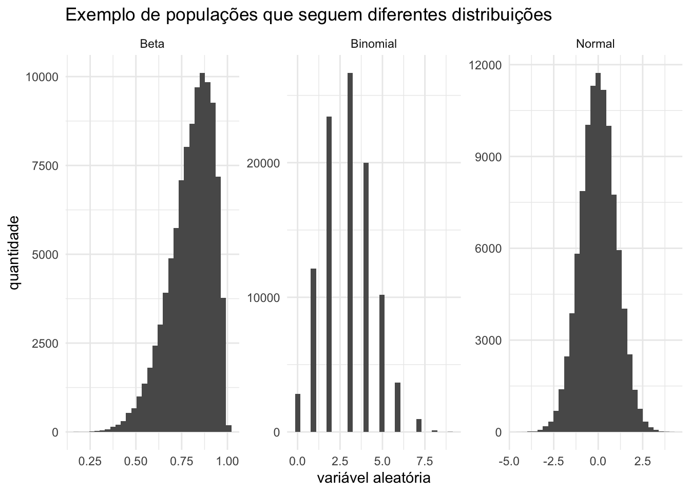 No gráfico abaixo, simulamos populações que seguem algumas dessas distribuições para observar visualmente como elas se apresentam.