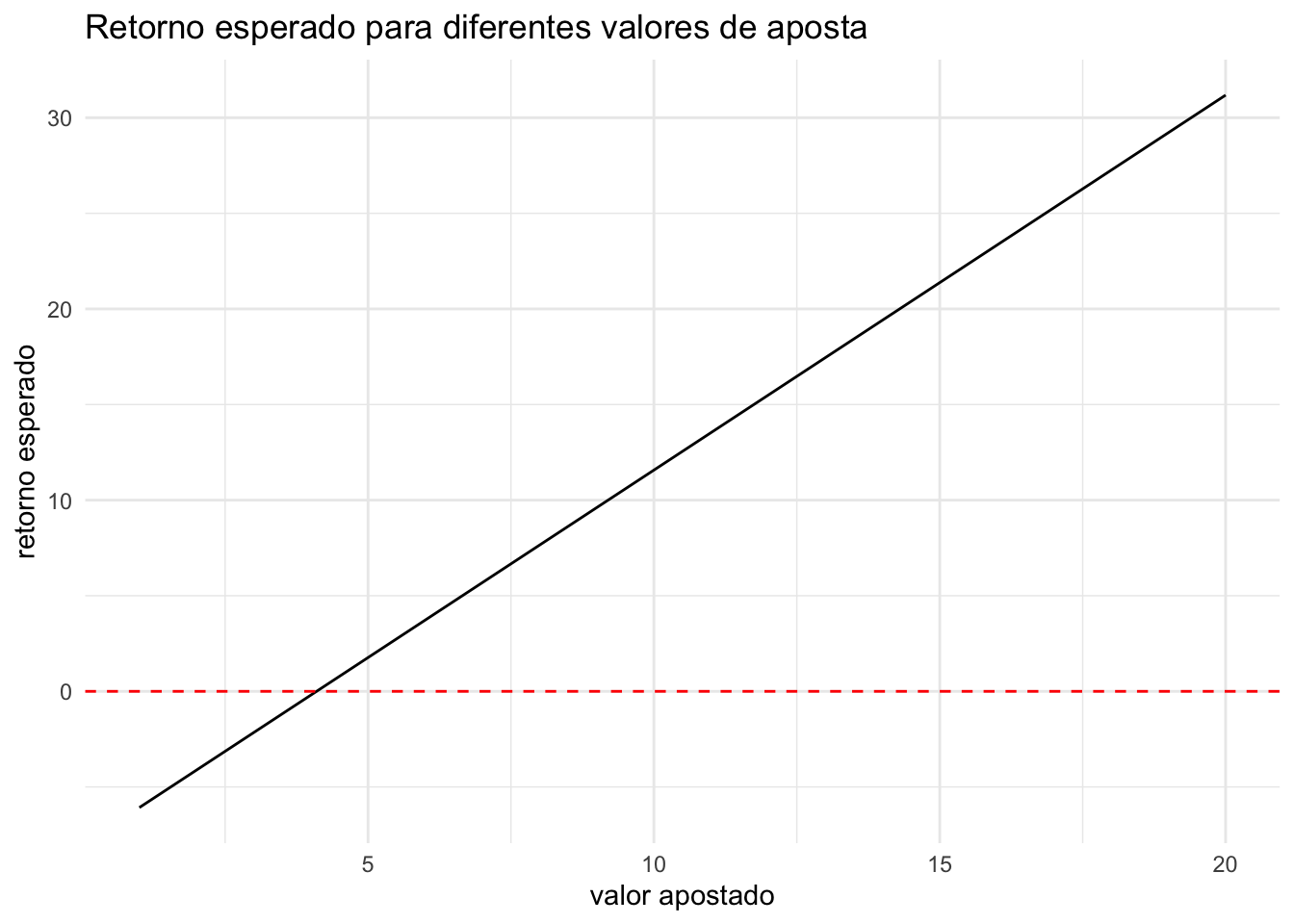 No código abaixo, calculamos o valor esperado da aposta considerando que o valor da aposta para as respostas “sim” dos entrevistados poderia variar entre R$ 1 e R$ 20. Pelo gráfico a seguir, observamos que, se o valor apostado por resposta “sim” fosse menor que R$ 5, Ana tenderia a perder dinheiro!