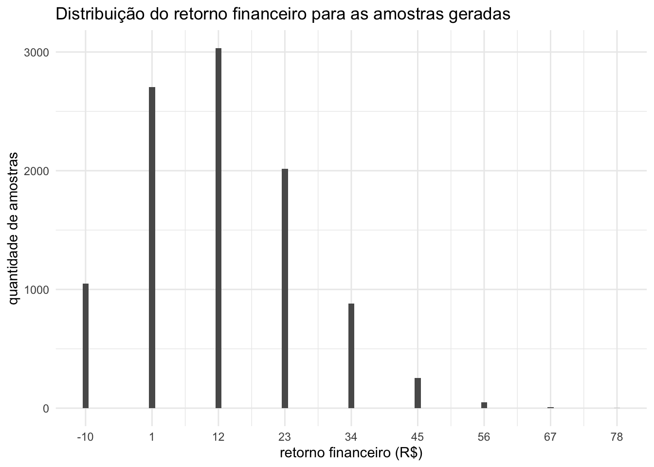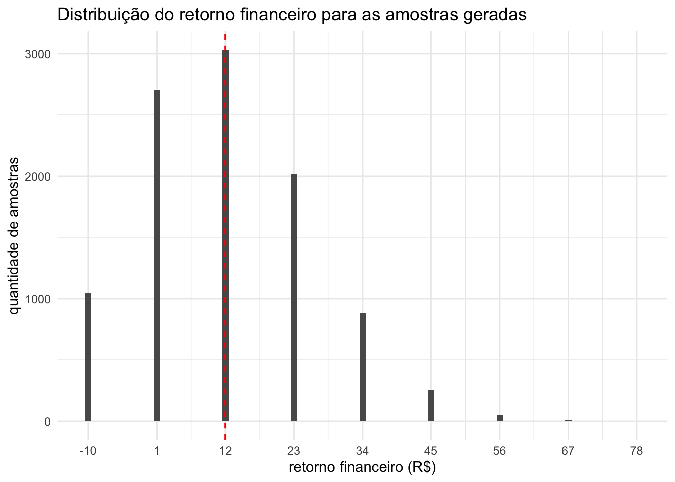 Pelo gráfico acima, observamos que, entre as 5.000 amostras simuladas, a maioria (cerca de 1.500 casos) resultou em um ganho de 12 reais para a Ana. O mais interessante é que esse resultado confirma exatamente a conta que fizemos lá em cima: se sabemos que 20% dos indivíduos da população respondem “sim” e 80% respondem “não”, o ganho esperado fica em 12 reais.